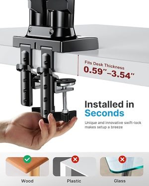 - Regarding the compatibility with desks, your desk must meet three conditions at the same time: First, desk material: Only wooden desks are recommended, plastic or glass desks cannot be used. Second, desk thickness range: 0.59″ – 3.54″. Third, the bottom of the desk should not have any cross beams or panels, as this will interfere with installation. We recommend carefully checking that your desk and monitors meets all above conditions before purchasing.