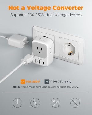 - 7 in 1 European Adapter: This power adapter US to Europe combines 4 AC outlets and 3 USB charging ports, allows you to charge 7 electronics simultaneously; Larger space makes power adapter Europe easier to fit all electric equipment without blocking; No need to carry extra adapter