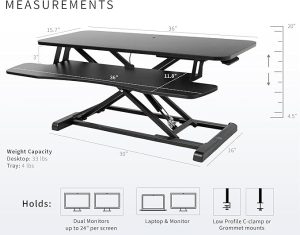 - Spacious 36” Surface: The top surface measures 36” x 15.7”, providing plenty of room for dual monitor and laptop setups. The 36” x 11.8” (10.2” in center) keyboard tray raises in sync with the top surface to create a comfortable workstation